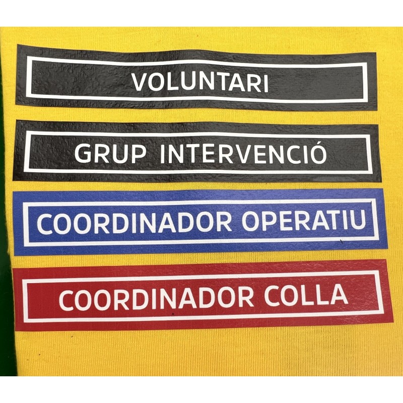 IDENTIFICADOR RANG ADF VOLUNTARI GRUP INTERVENCIÓ COORDINADOR OPERATIU COORDINADOR COLLA IDENTIFICADOR Termo aplicable sobre la roba molt resistent al rentat A baixa temperatura amb uns 20 cicles de rentada sense assecadora. Aplicable amb una planxa domèstica a 160 ° o posició 2 per a cotó durant 18" Extracció del film de plàstic i repàs amb un separador de paper cuina o tela fina durant 5" segons. Adjuntem forma d'aplicació amb la comanda.
